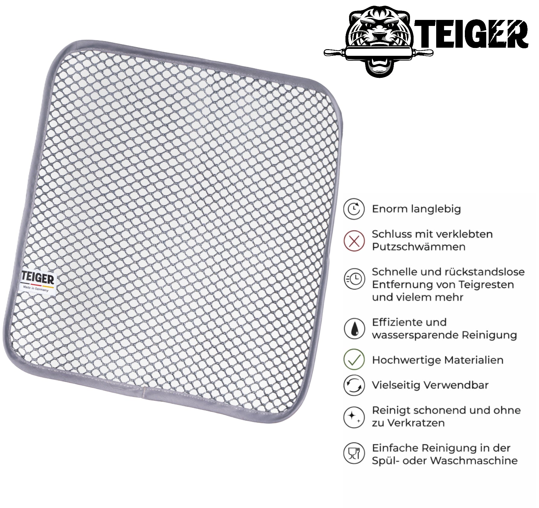 Der Teiger verbessert das Reinigungserlebnis und steigert die Freude am Kochen und Backen. Das spezielle Reinigungstuch entfernt Verschmutzungen schnell, gründlich und ohne Rückstände. Küchenutensilien, Geräte und sogar Hände lassen sich effizient reinigen und erstrahlen wieder in neuem Glanz.
